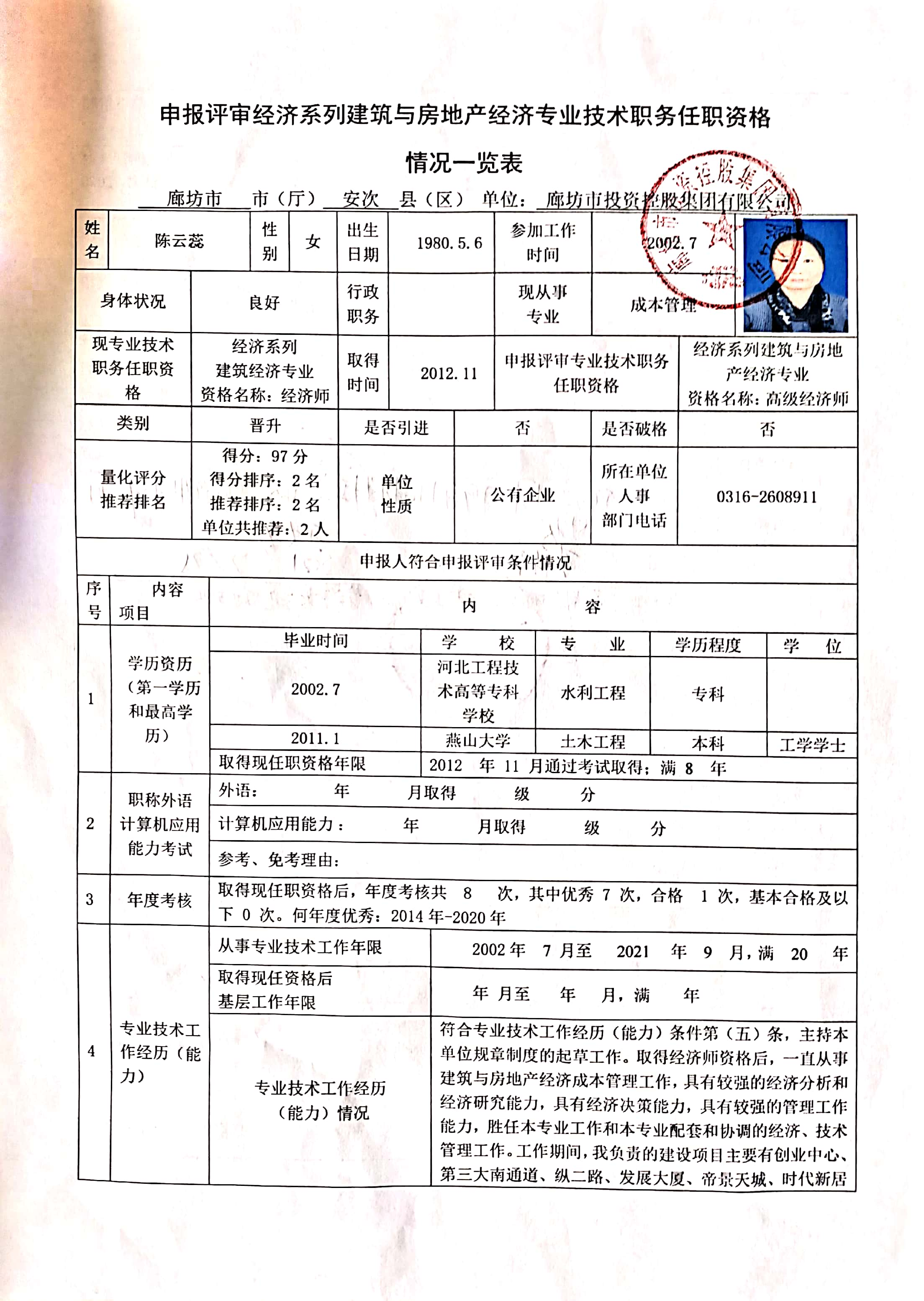 申報評審高級經濟師專業技術職務任職資格情況公示——陳云蕊