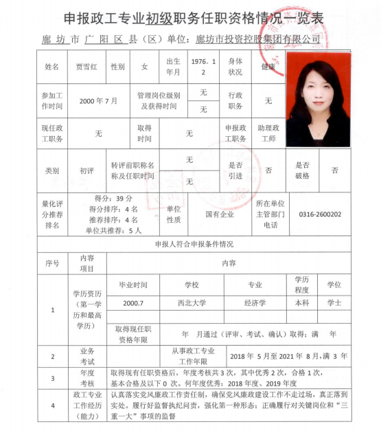 申報評審政工專業初級職務任職資格情況公示——賈雪紅