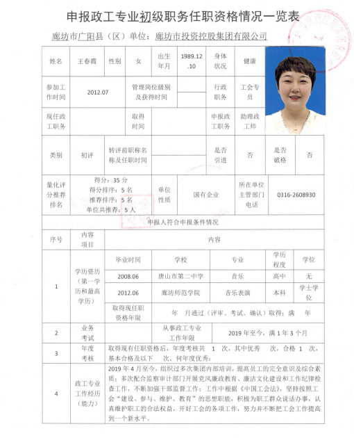 申報評審政工師專業初級職務任職資格情況公示——王春霞